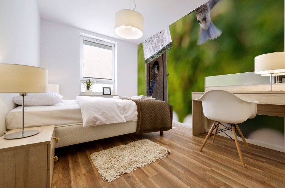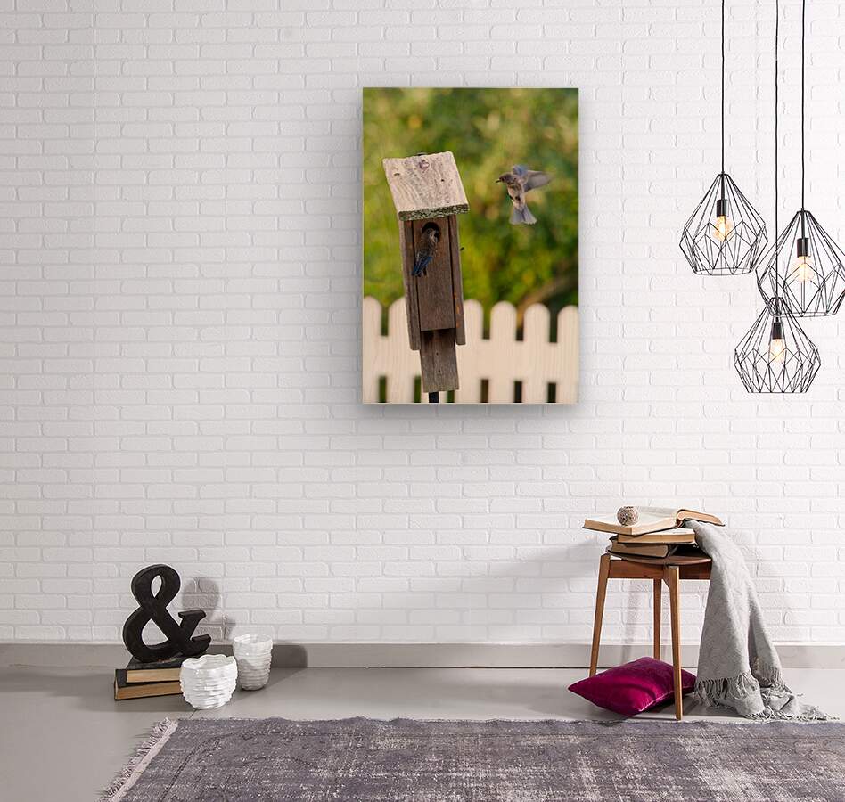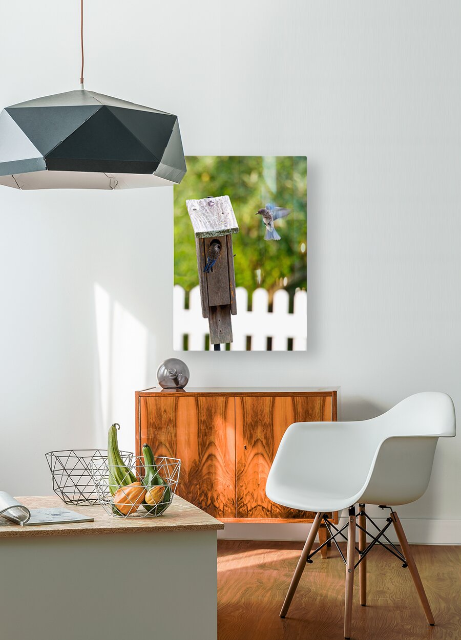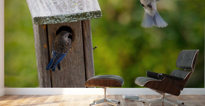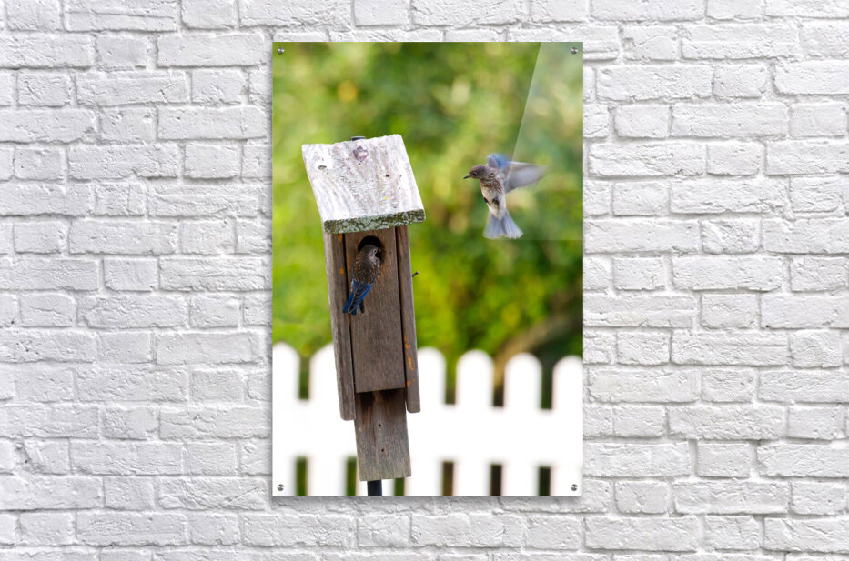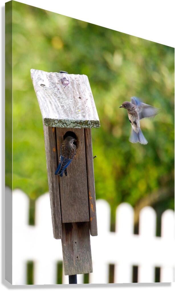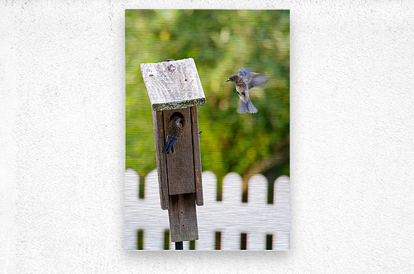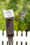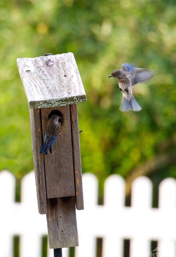 Baby bluebirds heading back to their nest in the birdhouse.