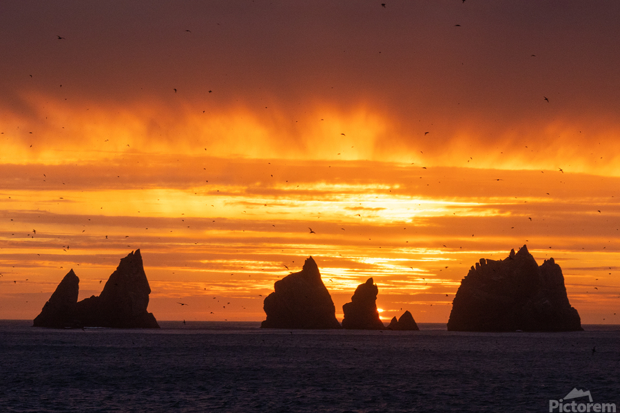 A sooty shearwater filled landscape of Snares Islands in New Zealand during sunset.