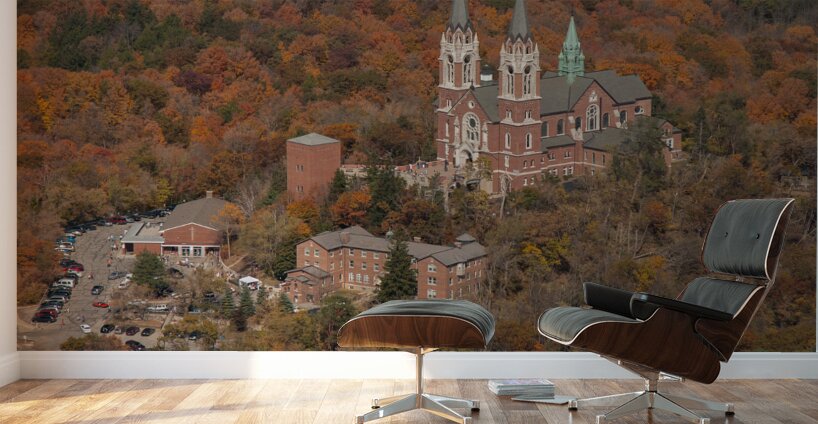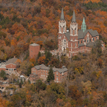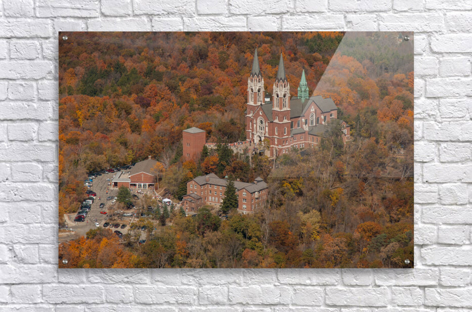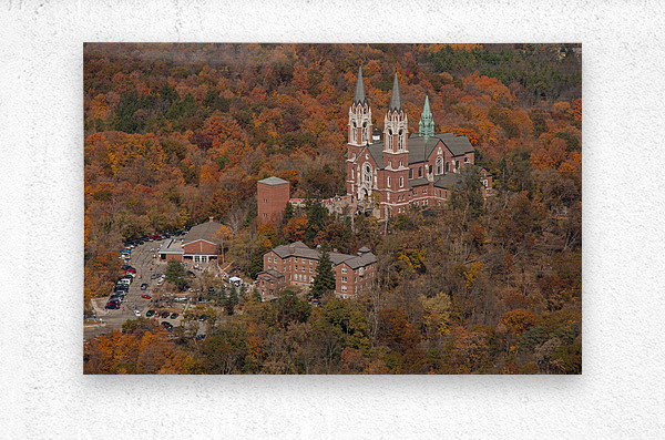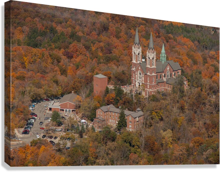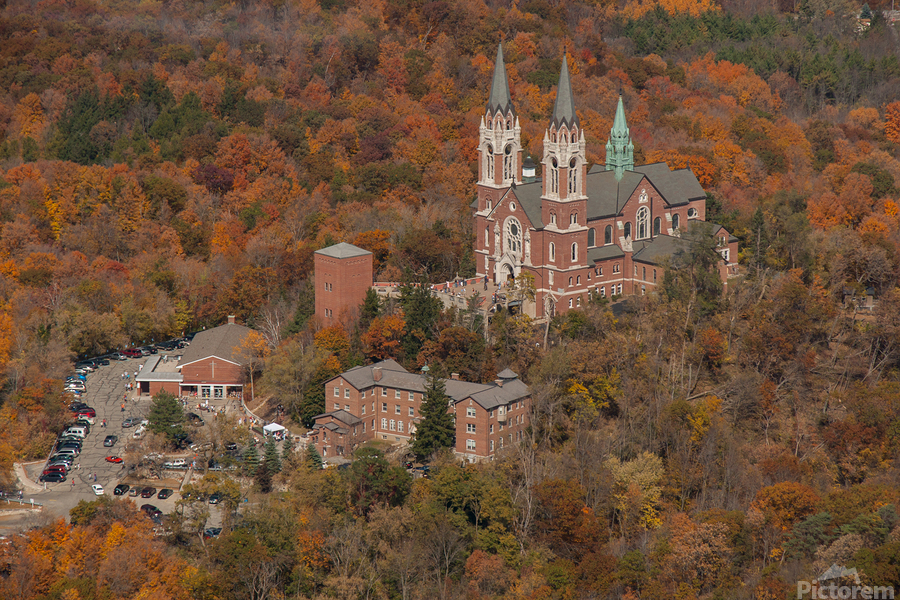 An aerial photo of the Basilica and National Shrine of Mary, Help of Christians at the Holy Hill in Erin, Wisconsin.
